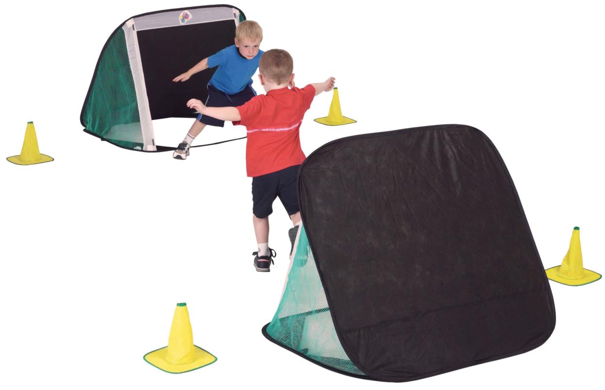 Deze set bestaat uit twee pop-up voetbaldoelen en vier pionnen. Ideaal voor snel spelplezier en eenvoudig op te bergen na gebruik.