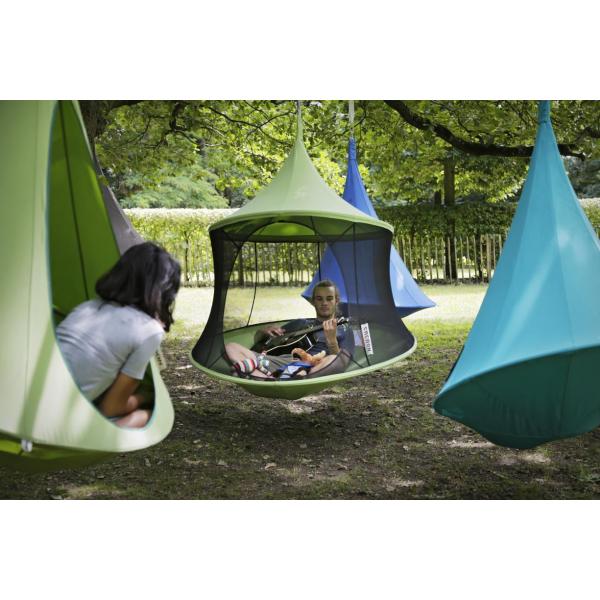 De Cacoon is bestand tegen water, kan de zomer buiten doorbrengen, maar kan worden opgeborgen voor de winter. Als er geen gebruik wordt gemaakt van de Cacoon, raden wij aan om deze binnen te hangen, zodat er geen nattigheid op de Cacoon kan komen. Doe dit bijvoorbeeld in de garage of speelkamer, of gewoon op zolder. Zorg dat er geen schimmel op de Cacoon komt. Hang de Cacoon ook niet vol in het zonlicht, dan zal de stof mooier blijven.